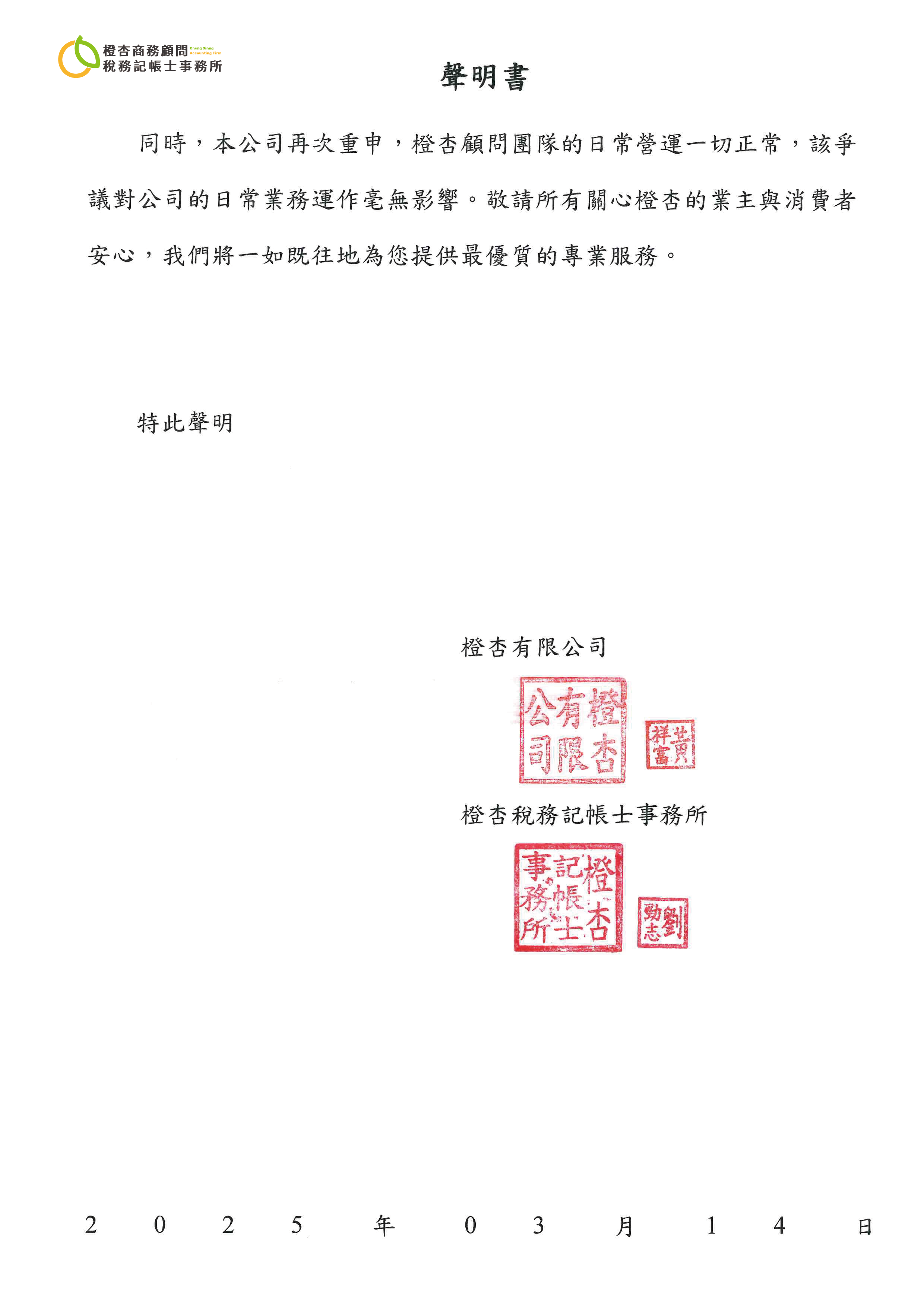 同時,本公司再次重申,橙杏顧問團隊的日常營運一切正常,該爭議對公司的日常業務運作毫無影響。敬請所有關心橙杏的業主與消費者安心,我們將一如既往地為您提供最優質的專業服務。