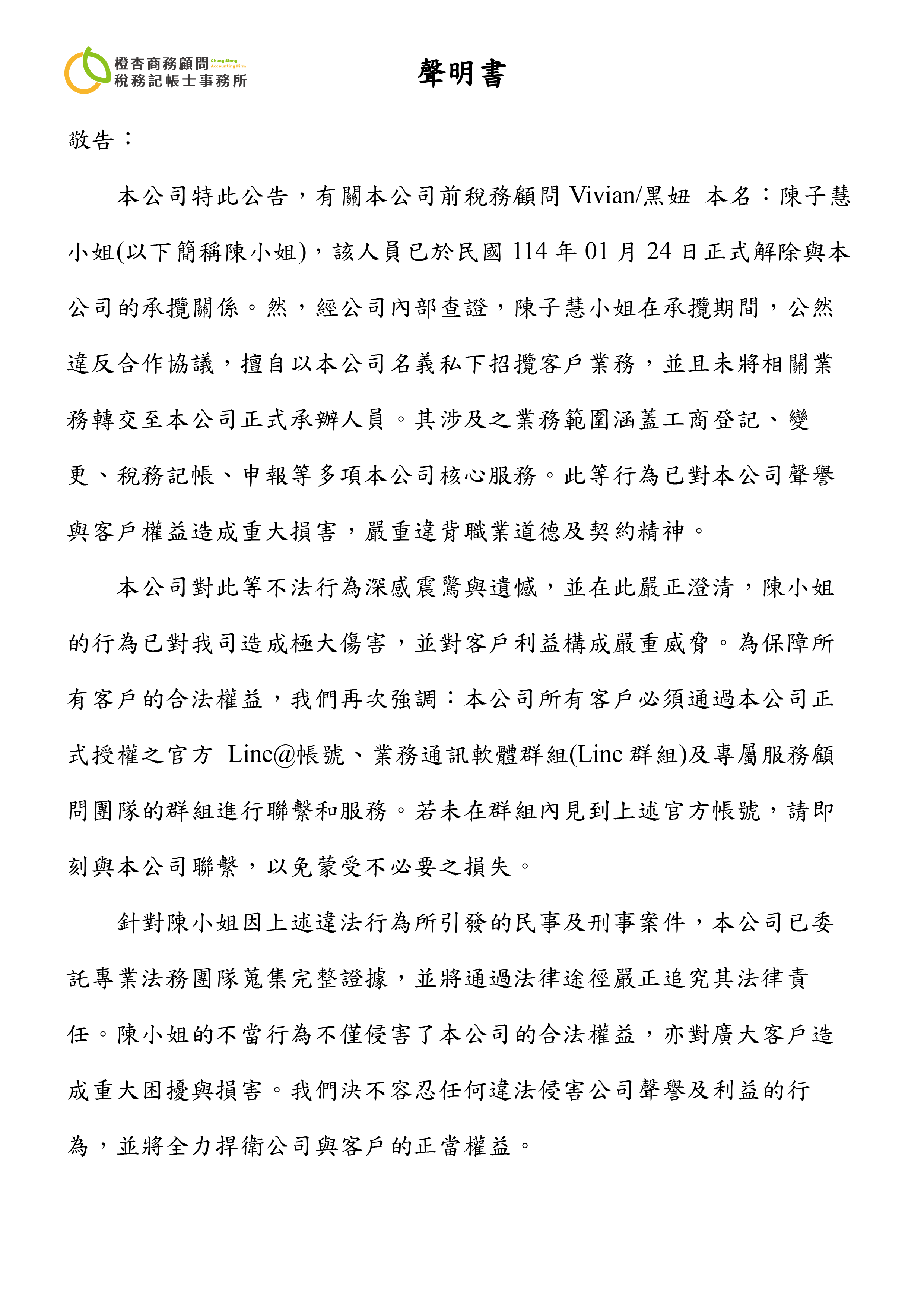 本公司特此公告,有關本公司前稅務顧問Vivia/黑妞 本名:陳子慧小姐(以下簡稱陳小姐),該人員已於民國114年01月24日正式解除與本公司的承攬關係。然,經公司內部查證,陳子慧小姐在承攬期間,公然違反合作協議,擅自以本公司名義私下招攬客戶業務,並且未將相關業務轉交至本公司正式承辦人員。其涉及之業務範圍涵蓋工商登記、變更、稅務記帳、申報等多項本公司核心服務。此等行為已對本公司聲譽與客戶權益造成重大損害,嚴重違背職業道德及契約精神。